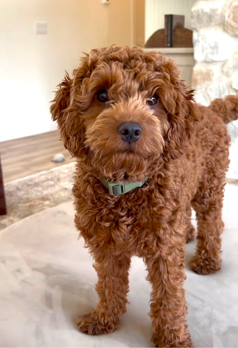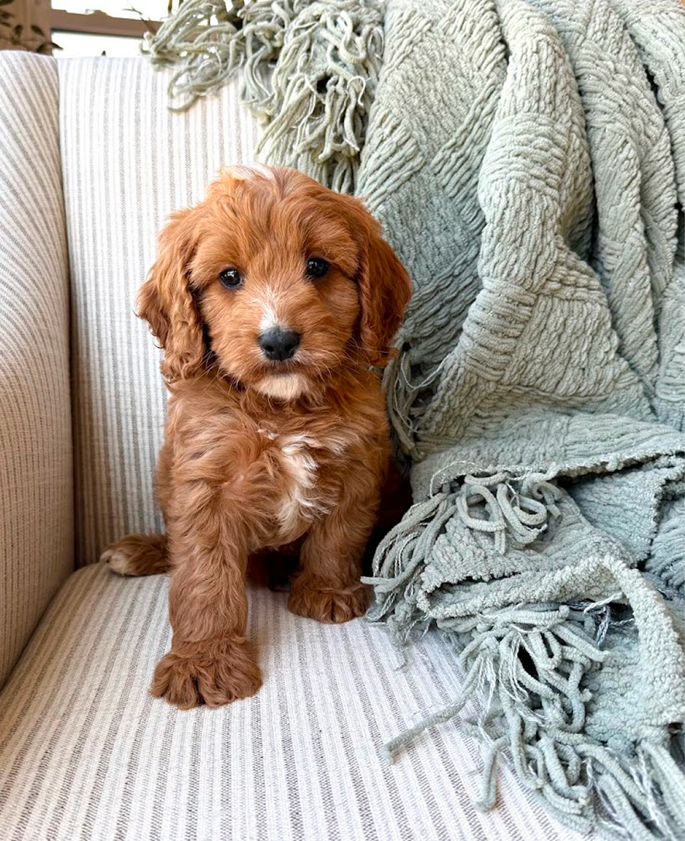 Penny (Cavapoo, 14 lbs, red curly coat) x Spot (Toy Poodle, 13 lbs)
