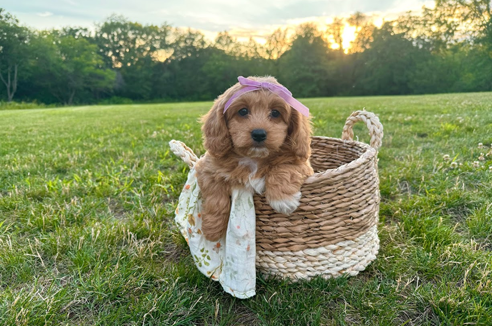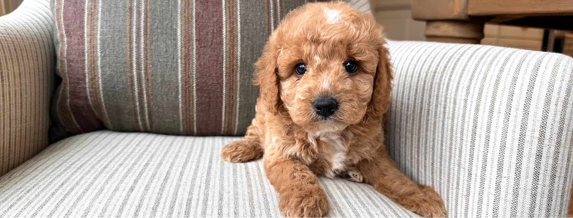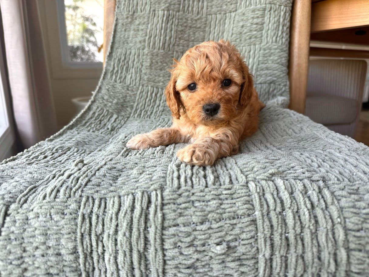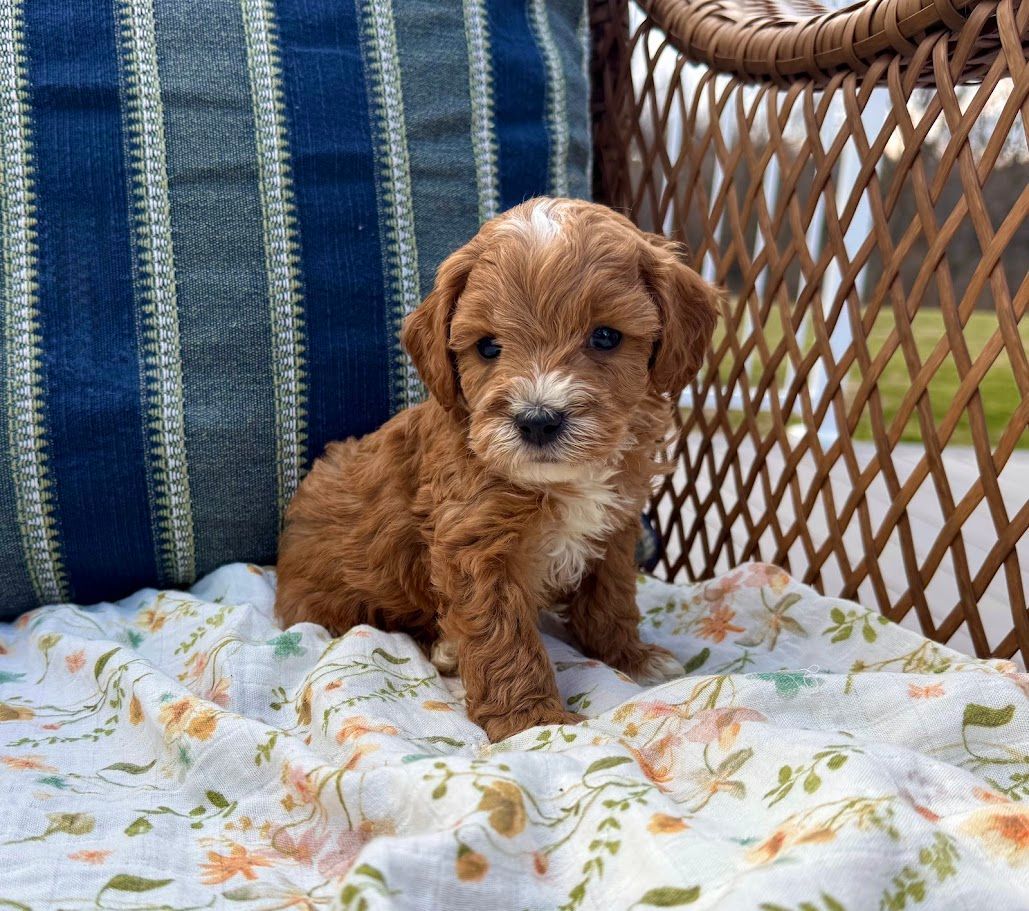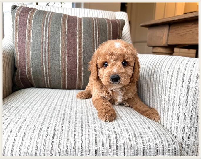 These Cavapoochons inherit Ava's calm, loving temperament and Bruno's clever and social personality. Expect gorgeous golden cream and brown-white coats on puppies that are naturally affectionate and wonderfully trainable. A dream families wanting a smaller companion who loves to be close!