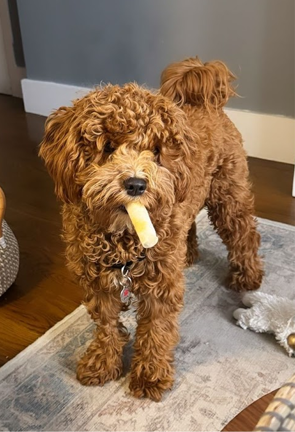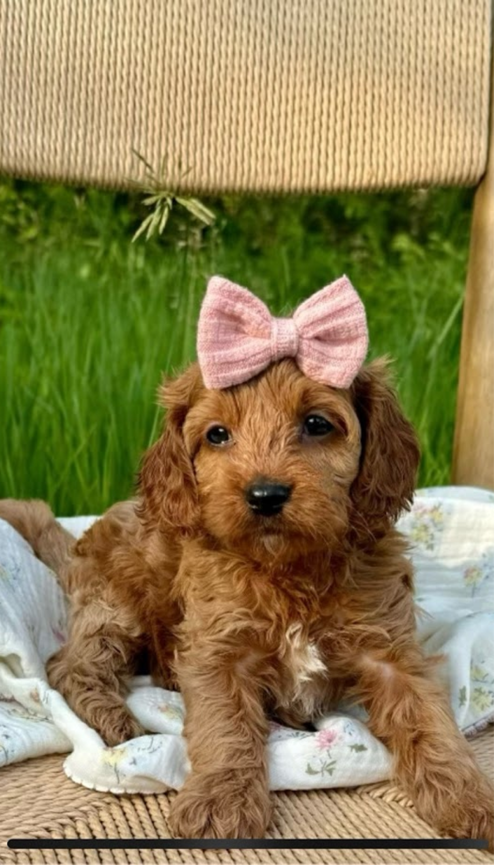 Penny (Cavapoo, 14 lbs, red curly coat) x Spot (Toy Poodle, 13 lbs)