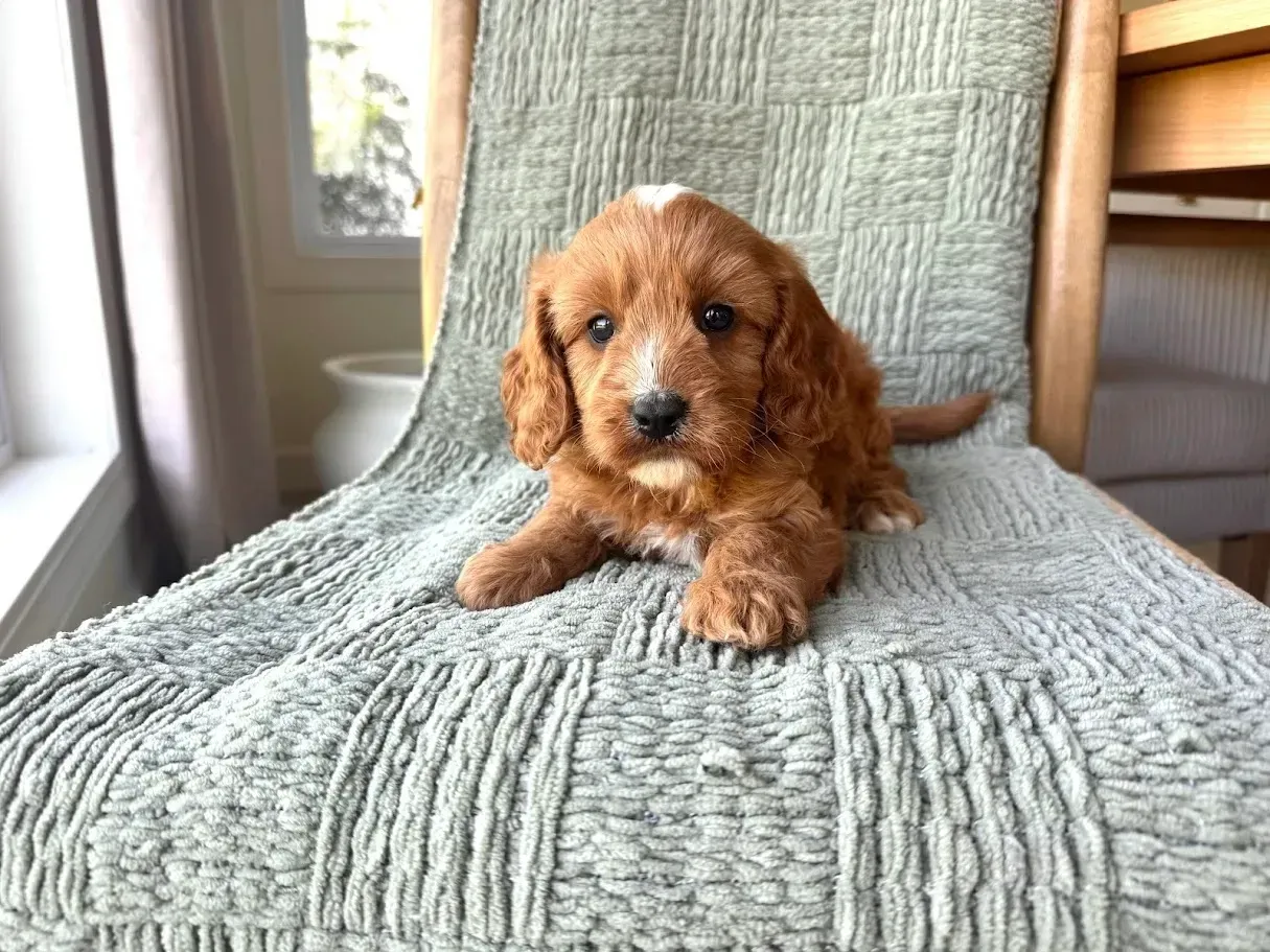 The F1b Cavapoo is hypoallergenic and tend to have a curlier coat due to the high percentage of poodle blood. They come in a full array of colors with red & aprocot being the most common!