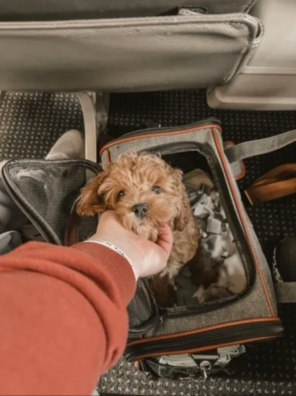 2) Purchase a doggy carrier that will fit underneath the seat in front of you (we provide this). Sadly, unless you get a dog loving flight attendant, you will have to keep your dog in the carrier and underneath the seat directly in front of your feet. Thankfully it truly seems like a cozy place for the puppies and they almost always fall asleep for the duration of the flight! Here is the carrier we suggest and provide you, https://amzn.to/40QIsct
